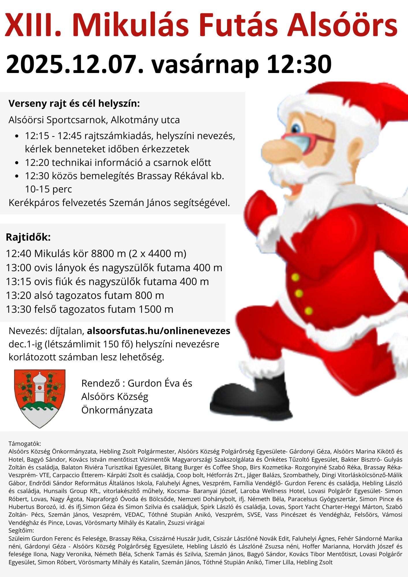 Idén immár tizenharmadszor rendezi meg Alsóörs Község Önkormányzata Gurdon Éva ultrafutóval karöltve a Mikulás Futást...