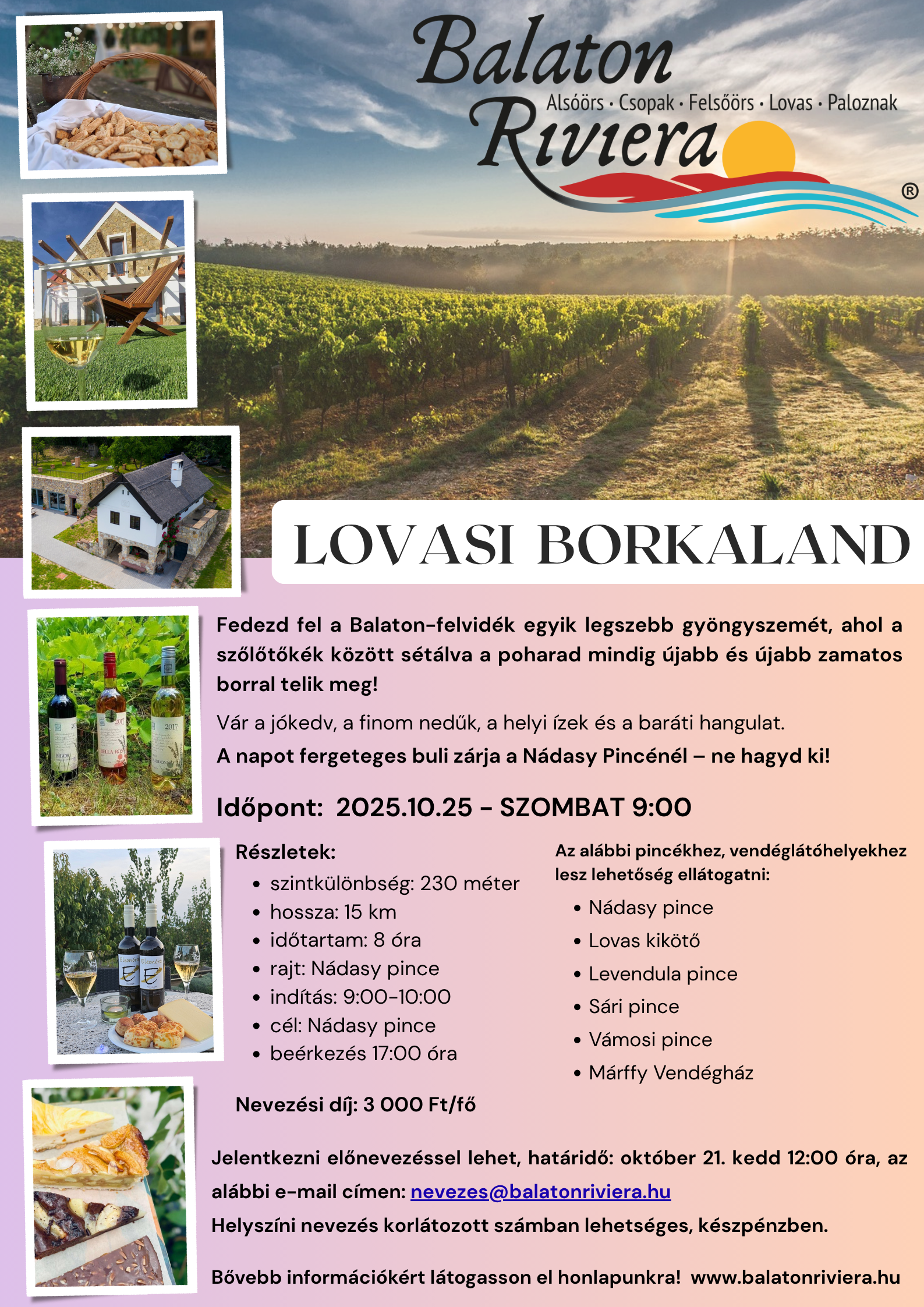 Jelentkezni előnevezéssel lehet, határidő: október 21. kedd 12:00 óra, az alábbi e-mail címen: nevezes@balatonriviera.hu