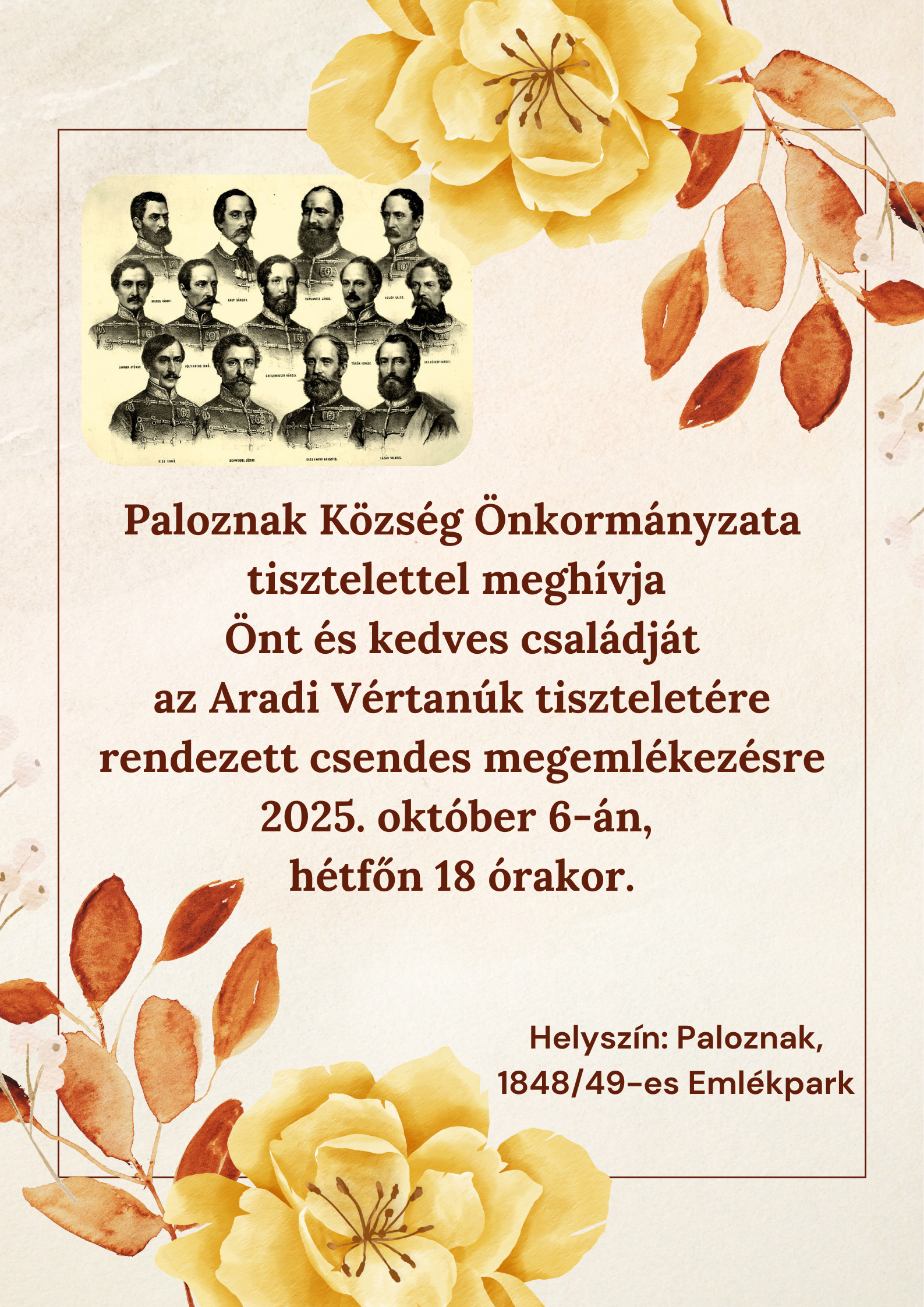 Október 6-án, a nemzeti gyász napján, Paloznakra az Emlékparkba hívjuk Önöket, hogy együtt hajtsunk fejet a 13 honvédtábornok, az aradi vértanúk emléke előtt, akik életüket áldozták a magyar nemzet szabadságáért.