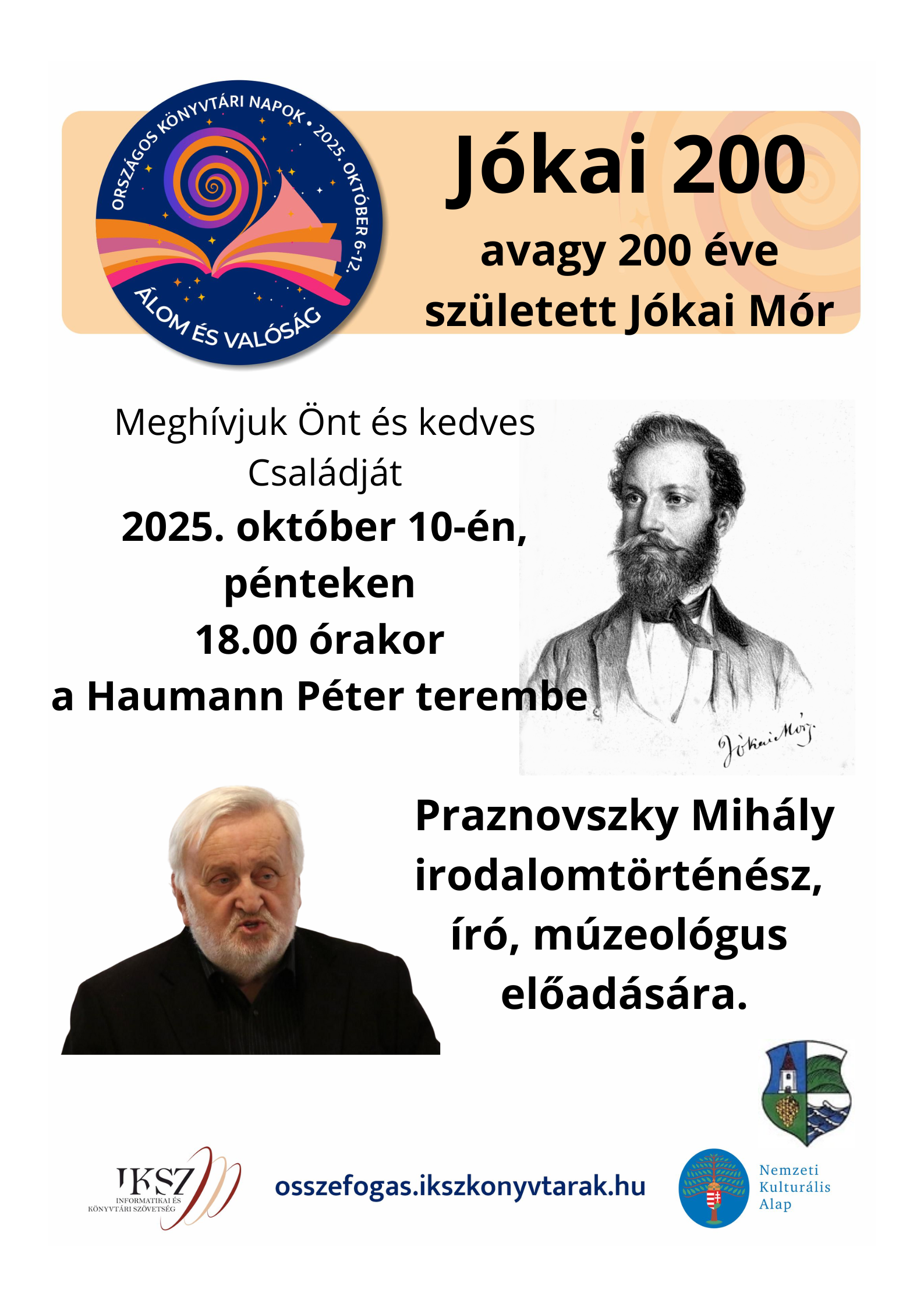 2025-ben ünnepeljük Jókai Mór, a magyar irodalom egyik legnagyobb alakjának kétszázadik születésnapját. E jeles alkalomból tisztelettel meghívjuk Önöket egy különleges irodalmi előadásra: