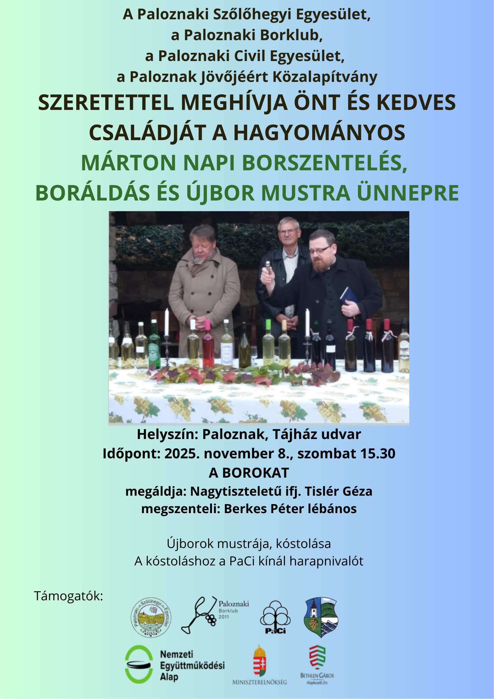 Hagyományos újbor kóstolásra és szentelésre invitálunk mindenkit a Tájház udvarára.