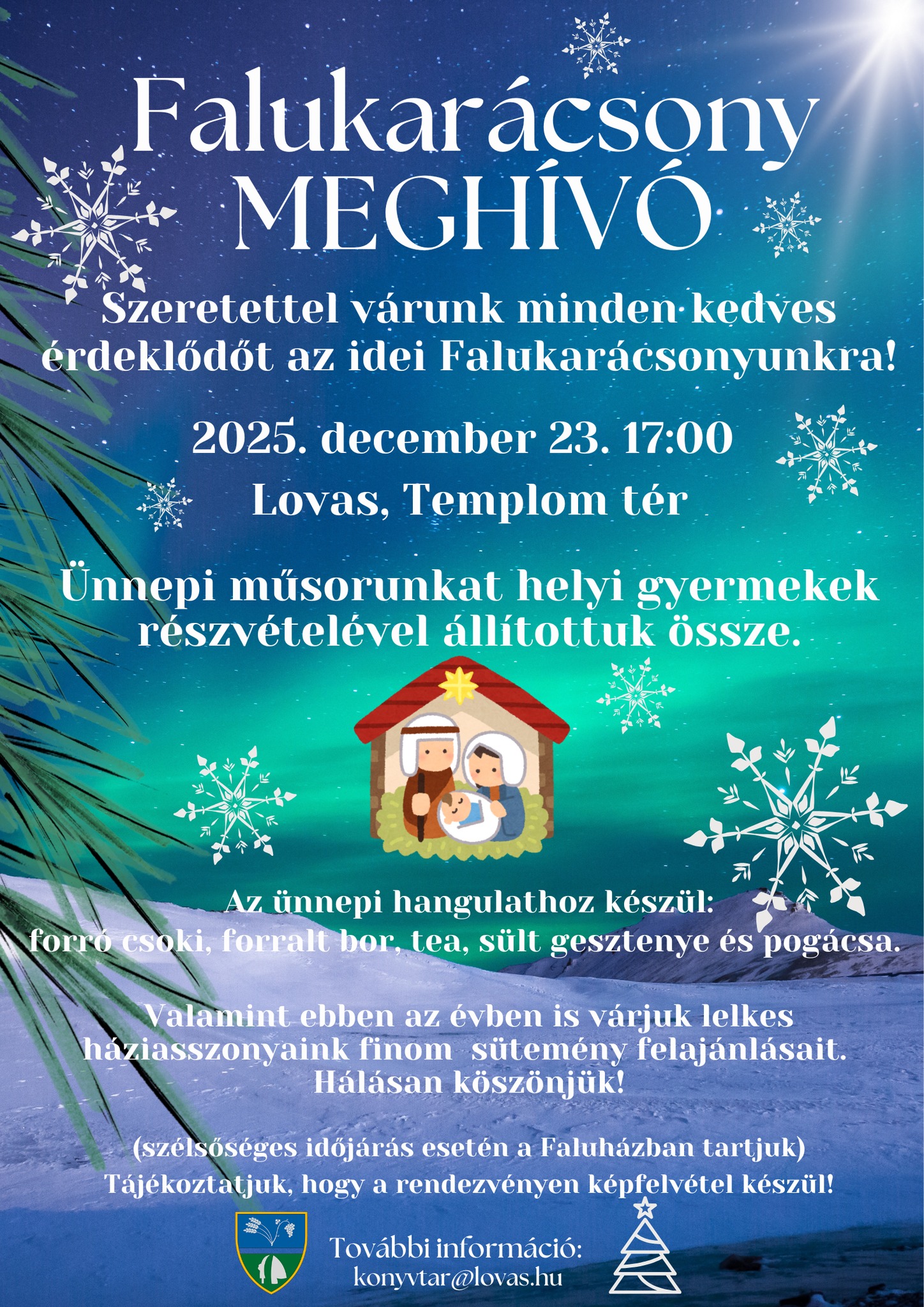 Szeretettel hívunk és várunk minden kedves lovasi lakost és érdeklődőt az idei Falukarácsonyra, ahol együtt készülődhetünk az ünnepre és élhetjük át a közösség varázsát.