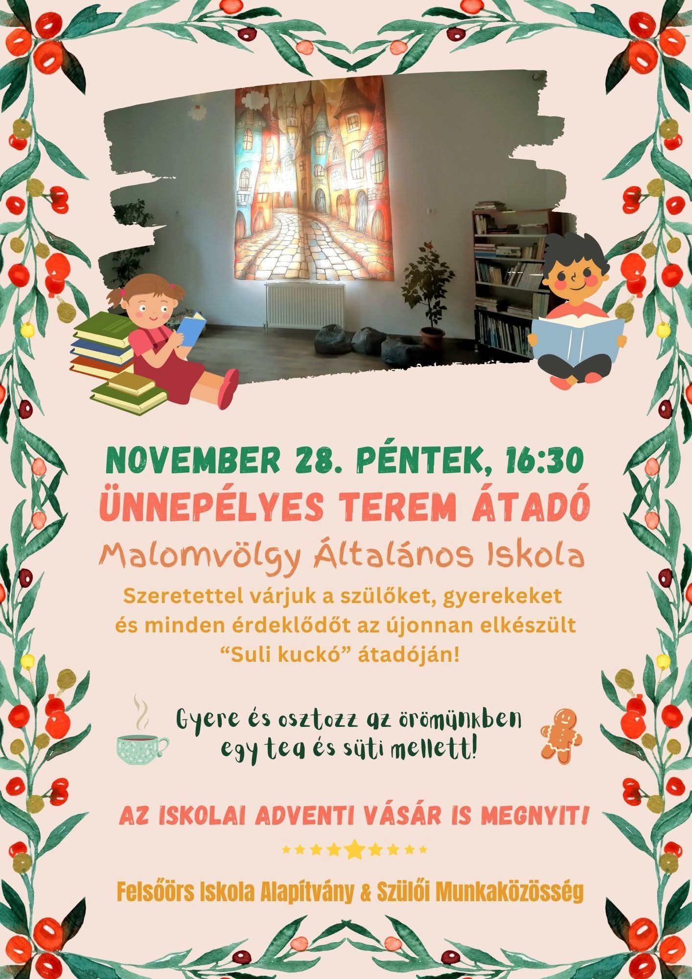 Szeretettel vár mindenkit november 28-án pénteken délután a Malomvölgy Általános Iskola ünnepi "Suli kuckó" átadó alkalmára iskolánk közössége!