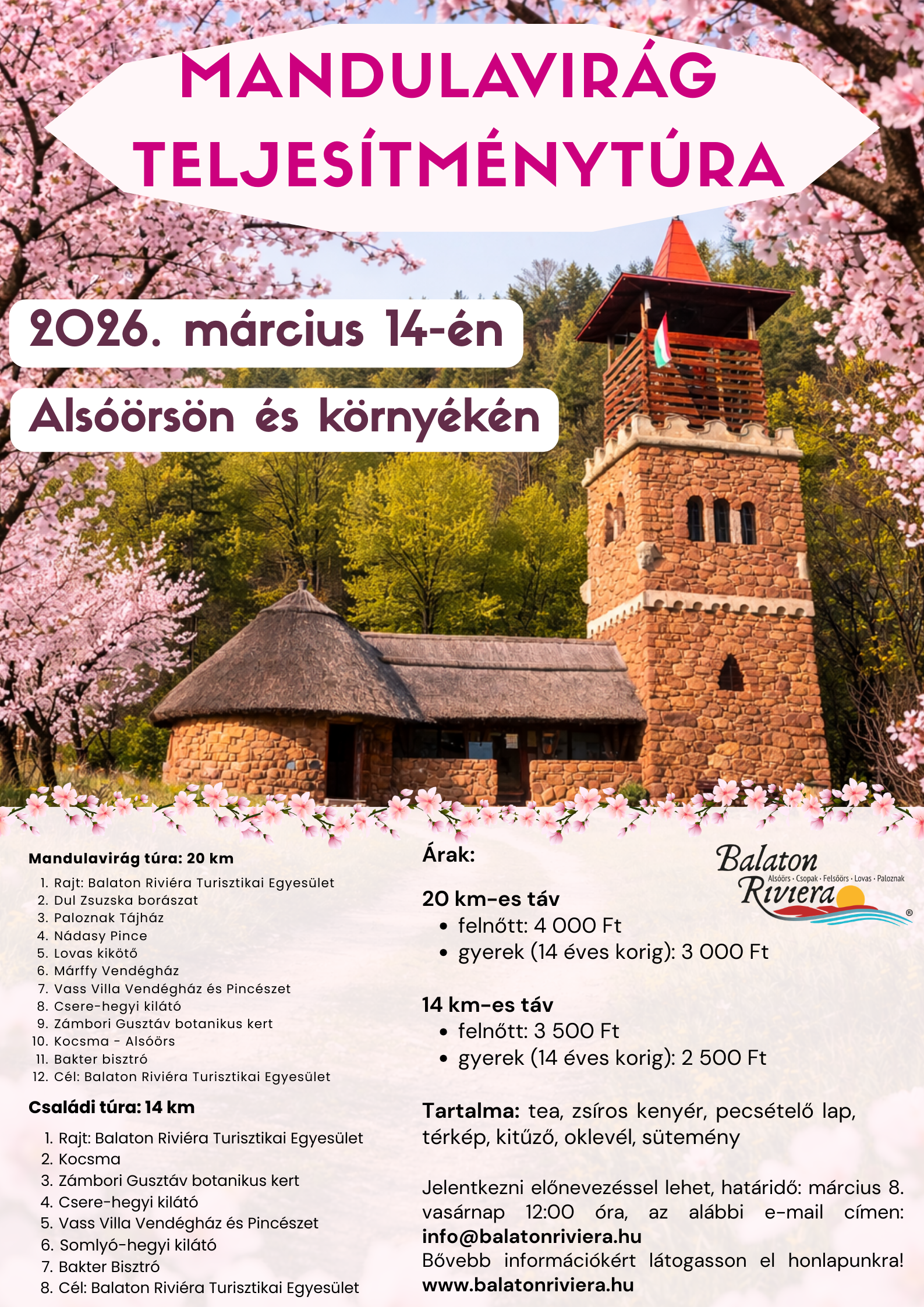 Ébredj a természettel együtt a Balaton Riviérán! 2008 óta hagyomány nálunk, hogy tavasszal közösen csodáljuk meg a környék legszebb arcát, a virágzó mandulafákat. Várunk téged, a családodat és a barátaidat egy hangulatos, aktív kikapcsolódásra!
